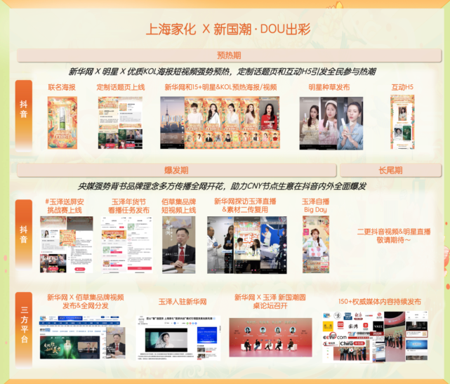 比如在爆发期,上海家化通过不同形式、不同层次的内容,对「玉泽」「佰草集」进行了进一步的声量扩散。这些动作包括#玉泽送屏安 挑战赛、玉泽年货节看播任务、佰草集品牌纪录片、新华网探访玉泽直播、新国潮线下主题论坛、玉泽自播Big day等。